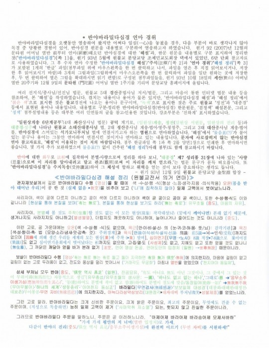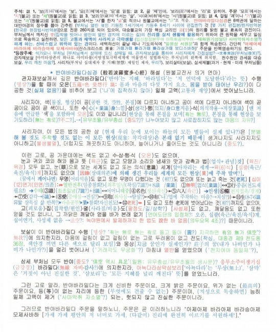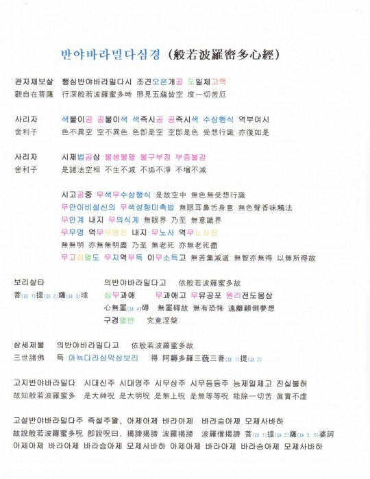 그림 파일로 3개를 올려 직접 보실 수 있게 하려 하였지만, 파일 크기 문제로 다 올라가지 못하고 일부분만 올려지는군요. '글쓴이: 김성연' 항목 바로 밑에서 찾을 수 있는 '반야바라밀다심경 및 해설(3쪽)' 첨부 한글 파일을 직접 열어보시거나 저장하여 읽어보시면 될 것 같습니다.